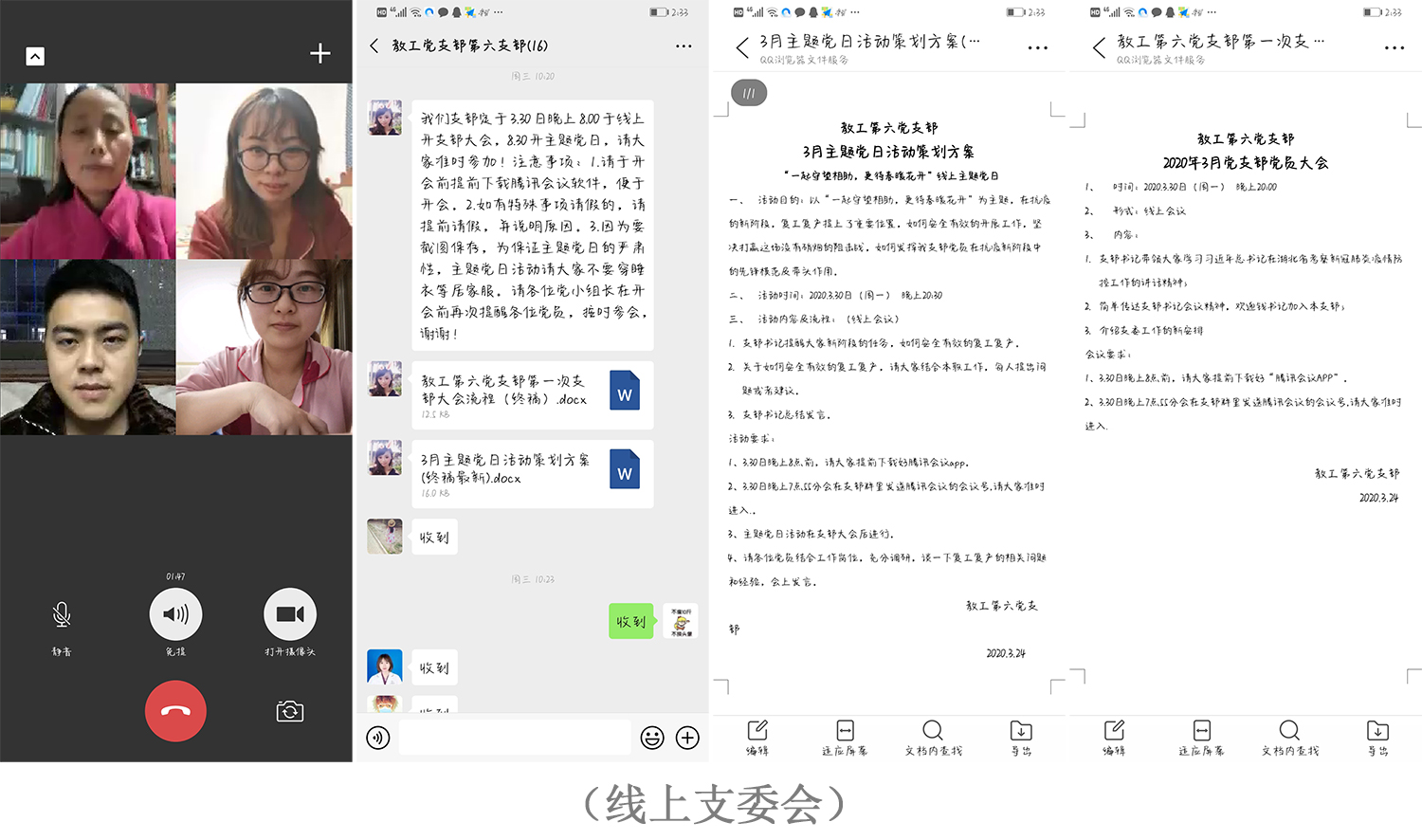 在抗疫关键时期,教工六支部坚持组织生活不断线,党员教育不停步,通过支部微信群、学习强国APP,在线视频会议等多种形式将“三会一课”制度常态化进行。组织党员学习疫情防控相关知识,教育党员引导身边群众学会辨别核实各类信息,抵制谣言散布,维护社会大局。