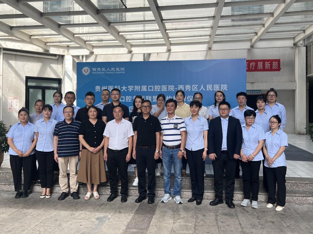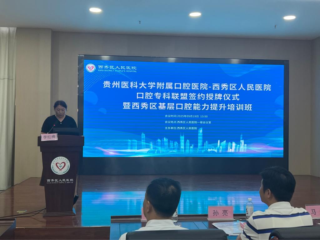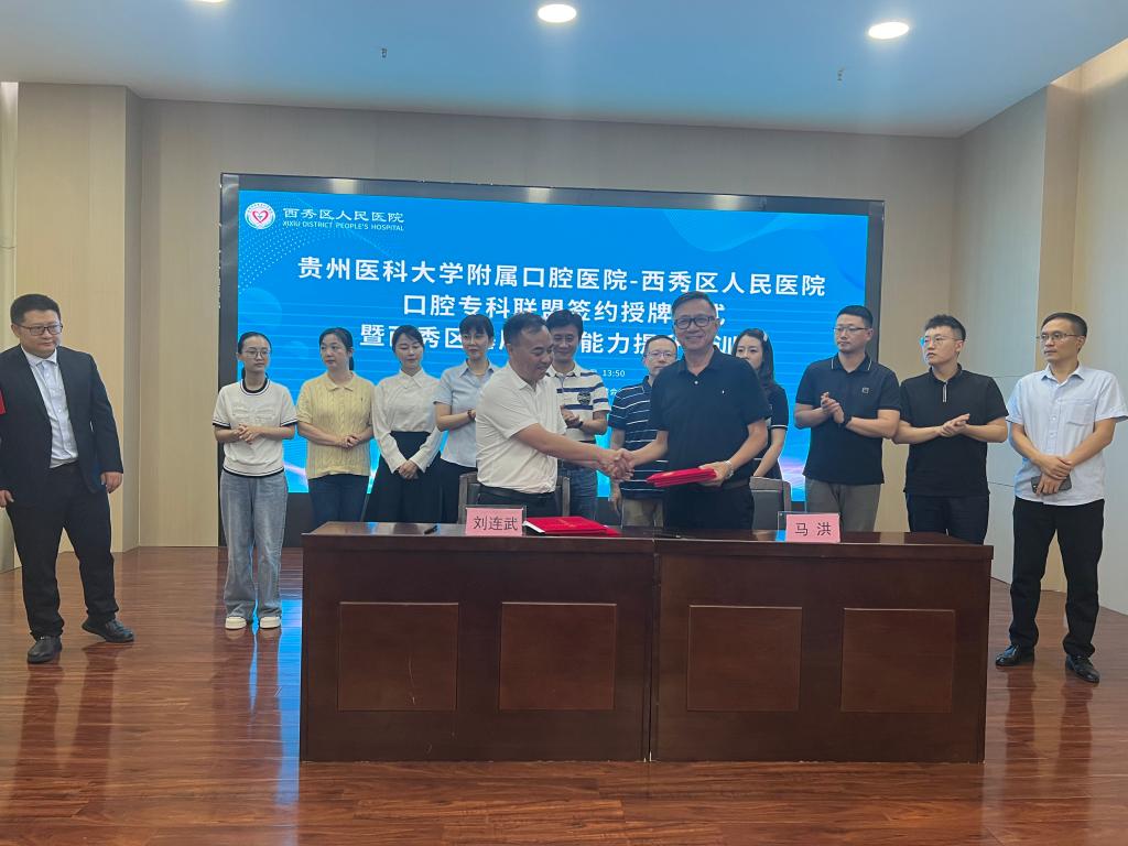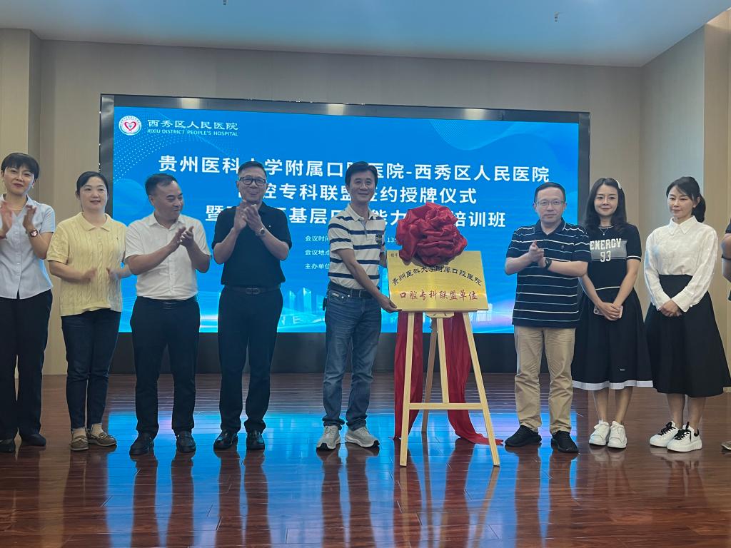 为积极响应国家医改政策,切实推动优质口腔医疗资源下沉,全方位提升基层口腔医疗服务能力,9月19日,我院党委副书记、院长马洪,党委委员、副院长董强带队赴安顺市西秀区人民医院参加专科联盟签约授牌仪式。安顺市西秀区委副书记孙亮、西秀区卫健局副局长李红梅、西秀区人民医院党委书记刘连武、西秀区人民医院副院长葛明惠出席会议。会议由李红梅主持。