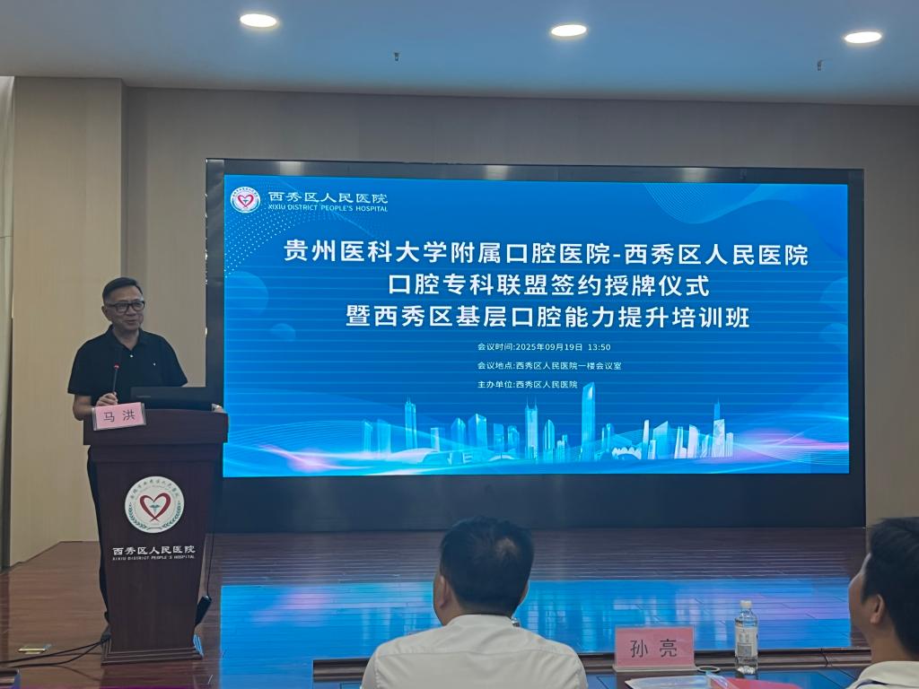 马洪在讲话中指出,此次与西秀区人民医院建立口腔专科联盟是落实国家分级诊疗政策、推动优质医疗资源下沉的关键举措,我院作为省级口腔专科医院,将充分发挥自身在学科建设、人才培养和技术创新方面的优势,通过建立长效帮扶机制,让基层患者在家门口就能享受同质化服务,通过紧密型专科联盟建设,真正实现资源共享、优势互补,共同构建覆盖全生命周期的口腔健康服务网络,切实解决群众"看牙难、看牙贵"的问题。