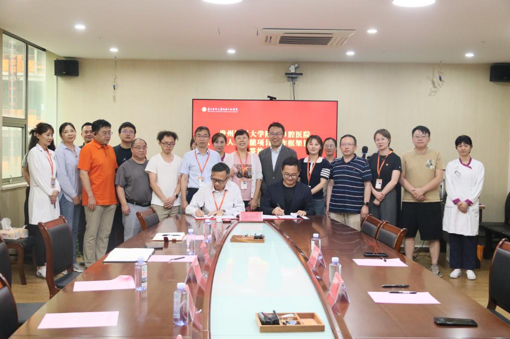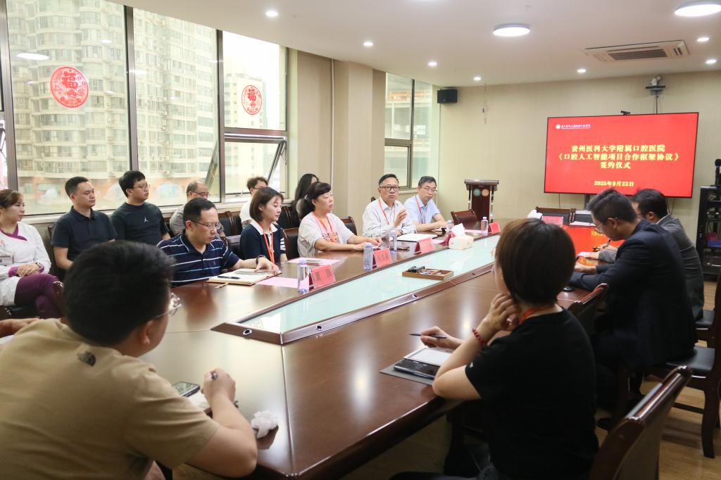 会上,马洪为签约仪式致辞,对北京羽医甘蓝信息技术有限公司一行的到来表示欢迎,并介绍了双方参会人员和医院基本情况。他表示,我院作为省内口腔医疗的领军机构,拥有悠久的历史和深厚的文化底蕴,多年来,我院在学科建设、人才培养、科研创新等方面成就显著,形成了完整的学科体系,拥有高素质专业化的医疗团队,此次合作是我院顺应潮流、提升核心竞争力和在数字化转型上的重要举措,希望各科室主动结合自身工作实际,充分发挥专业优势,提出创新想法和具体做法,打破传统思维,积极探索人工智能在口腔诊疗、教学、科研等方面的应用,共同推动口腔医疗领域的智能化发展。同时,希望双方建立长期稳定合作关系,实现资源共享、优势互补。