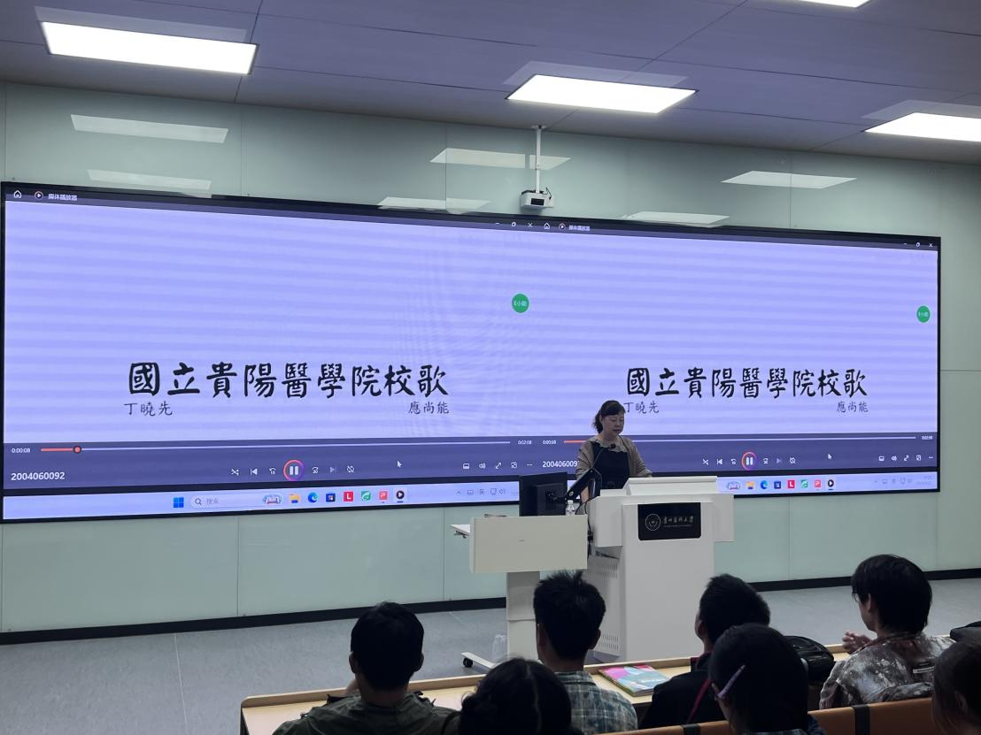 张军梅鼓励新生以归属感为动力,在未来职业道路上传承学院精神,无论从事临床、科研或基层工作,皆应铭记前辈奉献,承载学院荣光。讲座尾声,张军梅带领新生演唱了《国立贵阳医学院校歌》,在“展思将来,敬念既往”的旋律中强化爱笑荣院的情怀。