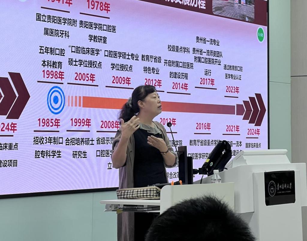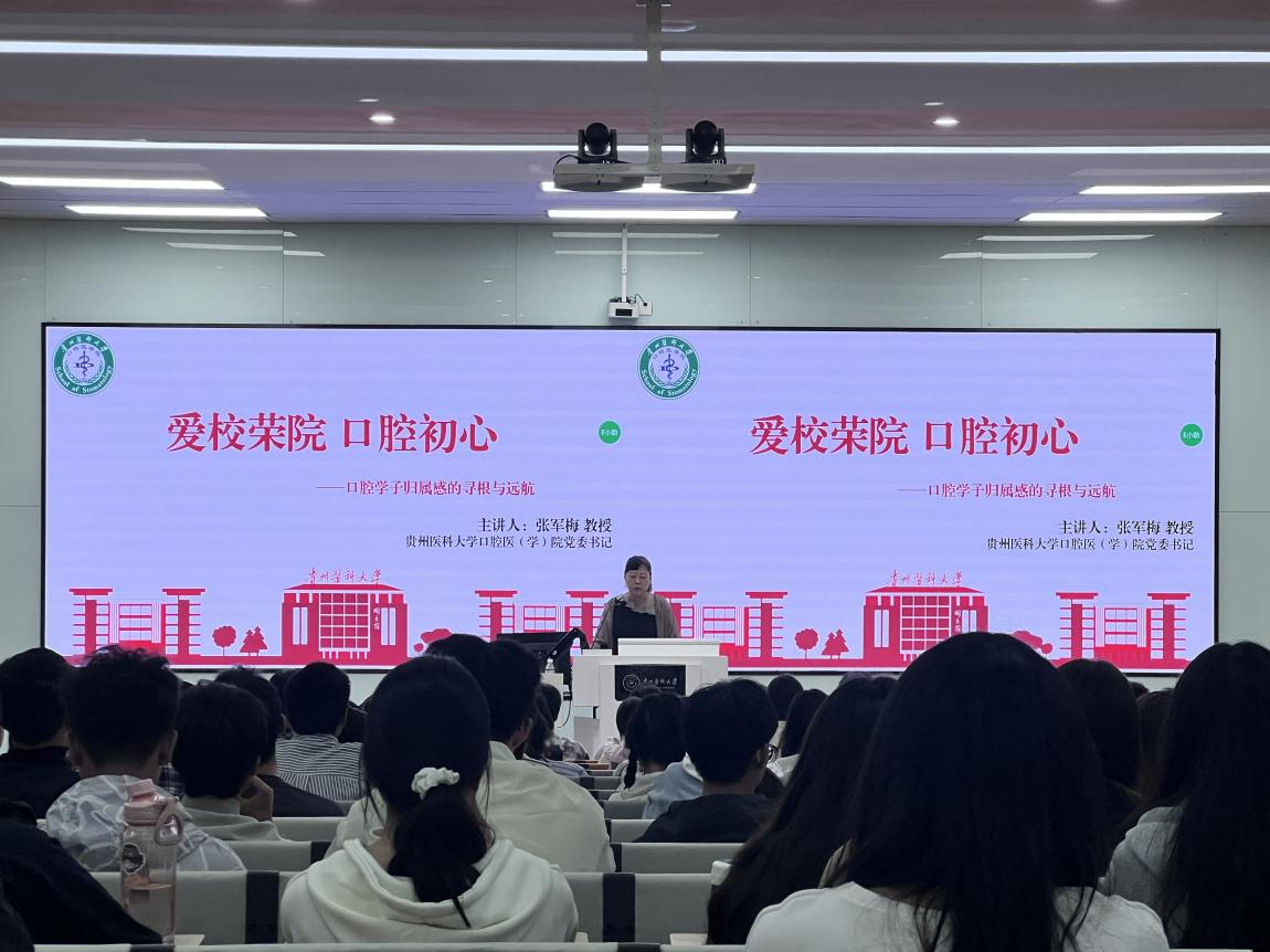 9月25日,院党委书记张军梅在云漫湖校区以“爱校荣院 口腔初心——口腔学子归属感的寻根与远航”为主题开展讲座,围绕溯源、明志、笃行、展望四个方面,带领新生共同探寻“贵医精神”与“贵医口腔”的发展历程。