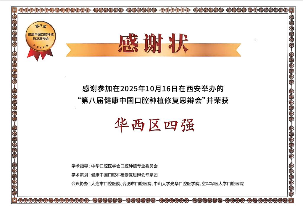 10月16日,由北京促进会主办、联合多地口腔院校共同发起的第八届全国口腔种植修复思辨会在西安曲江国际会议中心正式开幕。本次辩论赛共设七个辩题,八支队伍参加比赛。我院修复种植科主任田艾带领何子涵、程余婷、孟茂花、赵香琪、王欢5名青年医师参加比赛。经过初赛角逐,我院代表队晋级复赛,最终荣获华西赛区四强的优秀成绩。