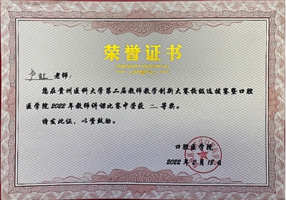 2018年在国家卫生计生委公益性行业科研专项第四次全国口腔健康流行病学调查工作中被评为“先进工作者”,2019年、2020年获永利yl23411官网附属口腔医院“临床科室学科建设个人价值贡献奖”,获评永利yl23411官网附属口腔医院“优秀职工”称号;2021年被评为永利yl23411官网“优秀教师”和院级住培优秀带教老师;2022年获第二届全国高校教师教学创新大赛校级选拔赛副高组三等奖,同年获yL23411永利讲课比赛二等奖;2023年获党员先锋示范岗教工第十一党支部第一季度“模范之星”。