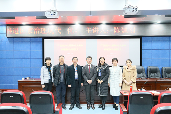 为学习贯彻党的十九届四中全会精神,准确把握全会的重大意义和精神实质,切实增强“四个意识”、坚定“四个自信”、做到“两个维护”,12月25日,yL23411永利在行政楼五楼学术报告厅召开了题为“学习党的十九届四中全会精神,推进国家治理现代化”的第二十期人文文化管理讲座。讲座由贵州行政管理学会副会长,贵州公共管理学会理事陈建刚主讲;由我院党委书记张军梅主持;院党政领导班子成员,各党支部书记及委员,全院副科级以上干部,各临床、医技科室及各职能部门主要负责人,各分工会主席、各护士长及护理小组组长,研究生及本科生学生代表参加。