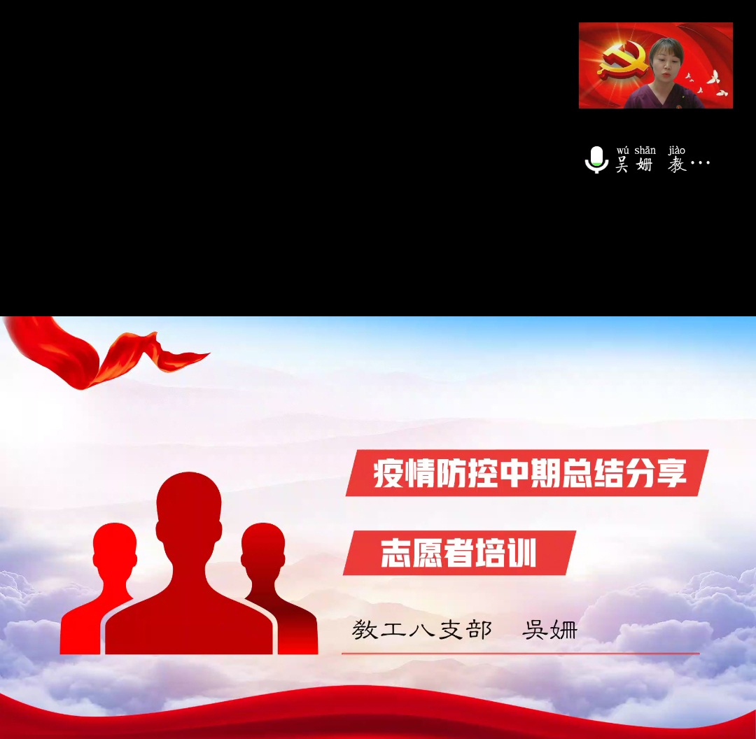 根据疫情防控需要及工作安排,本次联合主题党日活动在912日晚上采用线上视频会议的形式举行。会议由吴姗、朱铭慧两位支部书记主持,过程中吴姗、朱铭慧根据工作实际分别以“支部共建携手抗疫——疫情防控中期总结分享及志愿者工作培训”“发挥党员先锋模范作用,让党旗在“战疫”一线高高飘扬”为题开展专题学习。教工第五、八党支部全体党员、入党积极分子共计27人参会学习